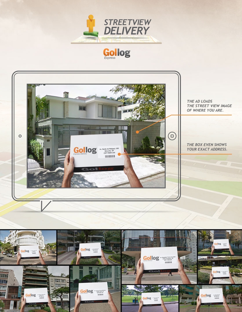 Gollog is Gol Airlines' delivery service. It finds recipients fast, no matter where they are. Our task was to communicate this benefit in tablet magazines. We combined the built-in GPS tracking technology with Google's Street View API to surprise each reader. It was very simple. The ad displayed the reader's Street View image on the screen, followed by an animated hand delivering the Gollog package. A tag on the package also showed the reader's exact address. The ad was featured in Brazil's most influential digital magazine - Veja. |